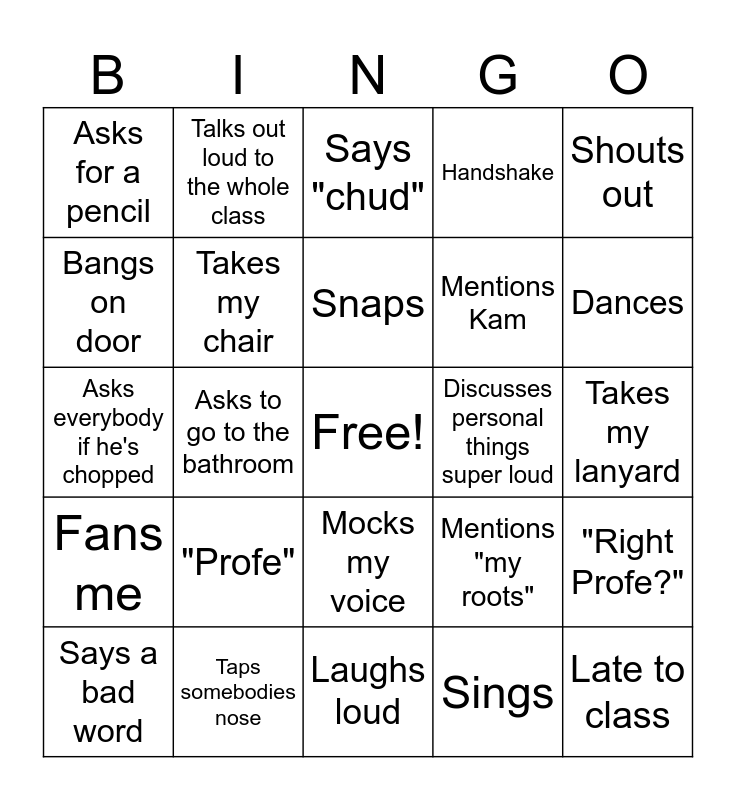 This bingo card has a free space and 24 words: "Profe", Taps somebodies nose, Snaps, Says a bad word, Shouts out, Asks for a pencil, Bangs on door, Talks out loud to the whole class, Discusses personal things super loud, Mocks my voice, Mentions Kam, Asks everybody if he's chopped, Mentions "my roots", "Right Profe?", Takes my chair, Sings, Takes my lanyard, Says "chud", Dances, Asks to go to the bathroom, Late to class, Fans me, Handshake and Laughs loud.