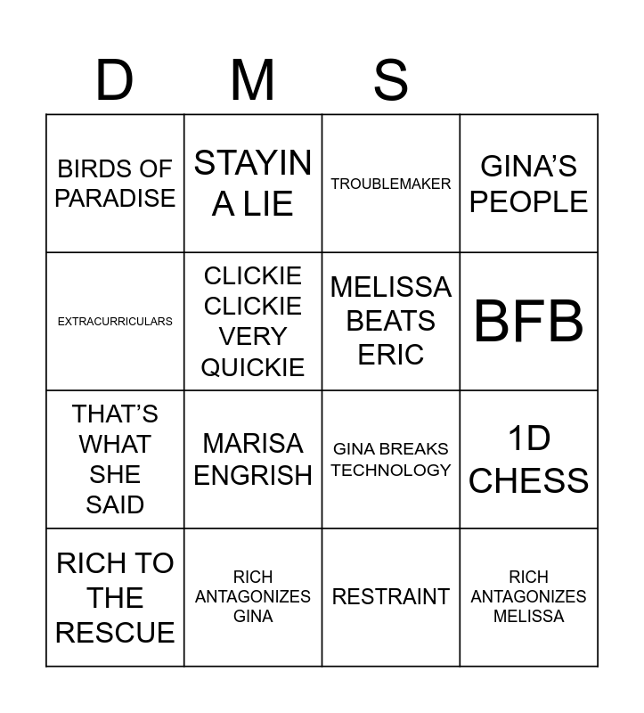 This bingo card has 32 words: Free!, STEP BROTHERS, 1D CHESS, MELISSA MATCHUP, RICH ANTAGONIZES MELISSA, MELISSA BEATS ERIC, EXTRACURRICULARS, RESTRAINT, STAYIN A LIE, IN THE NEWS, BFB, TROUBLEMAKER, 3X FAMILY CALL MELISSA, TERRIBLE PERSON AWARD, RICH ANTAGONIZES GINA, SUPER SECRET MEETING, 8:30am-10am, GINA BREAKS TECHNOLOGY, MOBY RICH, HAZED AND CONFUSED, CURB YOUR ENTHUSIASM, THE PRICE IS WHITE, RESTRAINT, GOOD IDEAS ARE BAD, RICH TO THE RESCUE, GINA’S PEOPLE, THAT’S WHAT SHE SAID, CLICKIE CLICKIE VERY QUICKIE, BIRDS OF PARADISE, BLOWY SCHMOEY, FLIPPY FLIPPY and MARISA ENGRISH.