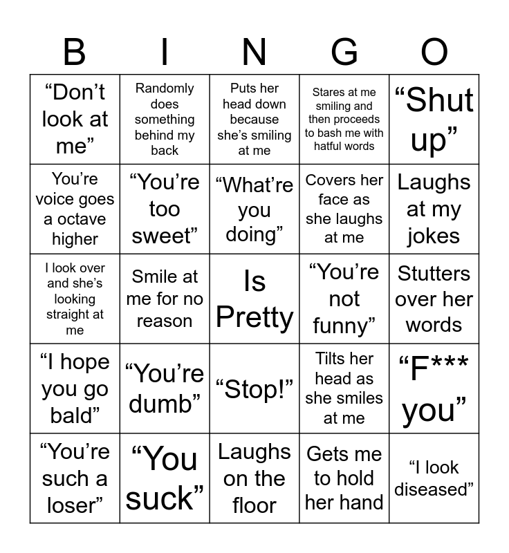 This bingo card has a free space and 24 words: “You’re dumb”, “You suck”, “What’re you doing”, “You’re such a loser”, “Shut up”, “Don’t look at me”, You’re voice goes a octave higher, Randomly does something behind my back, “You’re not funny”, “Stop!”, Covers her face as she laughs at me, I look over and she’s looking straight at me, Tilts her head as she smiles at me, “F*** you”, “You’re too sweet”, Gets me to hold her hand, Stutters over her words, Puts her head down because she’s smiling at me, Laughs at my jokes, Smile at me for no reason, “I look diseased”, “I hope you go bald”, Stares at me smiling and then proceeds to bash me with hatful words and Laughs on the floor.