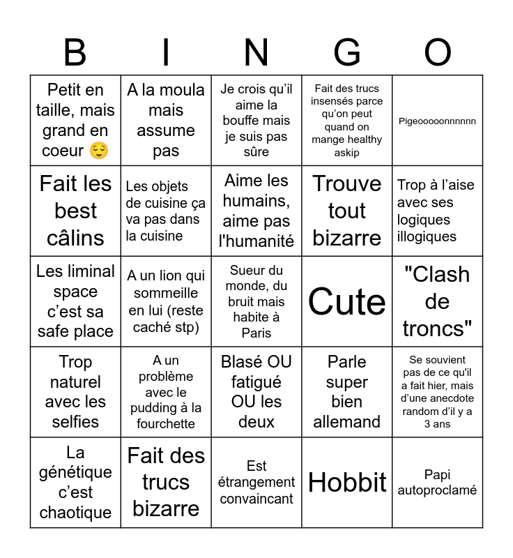 This bingo card has a free space and 24 words: A un problème avec le pudding à la fourchette, Fait des trucs bizarre, Aime les humains, aime pas l'humanité, La génétique c’est chaotique, Pigeooooonnnnnn, Petit en taille, mais grand en coeur 😌, Fait les best câlins, A la moula mais assume pas, Cute, Blasé OU fatigué OU les deux, Trouve tout bizarre, Les liminal space c’est sa safe place, Parle super bien allemand, Se souvient pas de ce qu'il a fait hier, mais d’une anecdote random d’il y a 3 ans, Les objets de cuisine ça va pas dans la cuisine, Hobbit, "Clash de troncs", Je crois qu’il aime la bouffe mais je suis pas sûre, Trop à l’aise avec ses logiques illogiques, A un lion qui sommeille en lui (reste caché stp), Papi autoproclamé, Trop naturel avec les selfies, Fait des trucs insensés parce qu’on peut quand on mange healthy askip and Est étrangement convaincant.