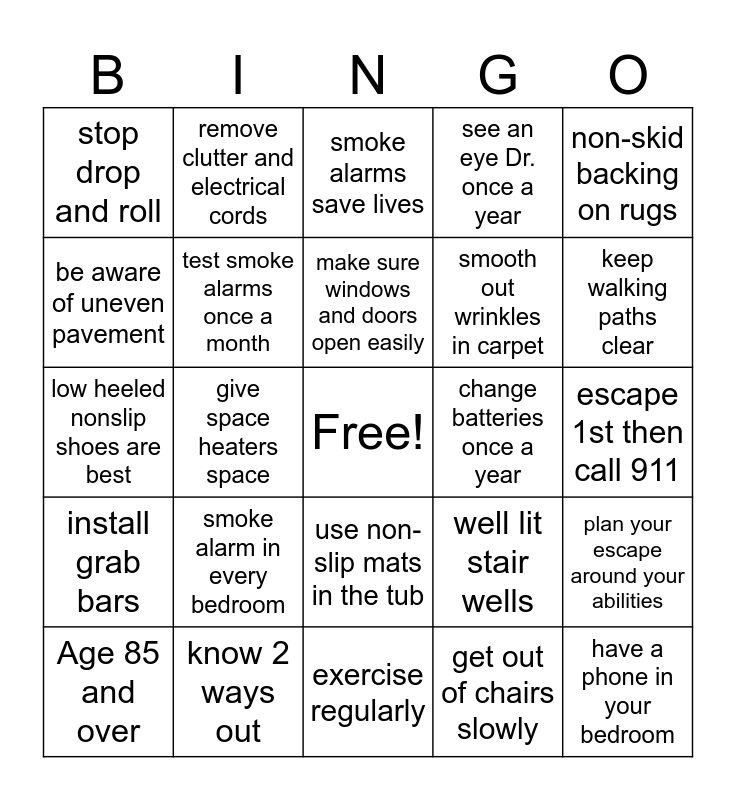 This bingo card has a free space and 29 words: Age 85 and over, never smoke around oxygen, give space heaters space, use a lid to stop oven fire, stop drop and roll, smoke alarms save lives, test smoke alarms once a month, smoke alarm in every bedroom, change batteries once a year, know 2 ways out, escape 1st then call 911, have a phone in your bedroom, exercise regularly, get out of chairs slowly, keep walking paths clear, use night lights, use non-slip mats in the tub, install grab bars, non-skid backing on rugs, low heeled nonslip shoes are best, well lit stair wells, handrails on both sides of stairs, smooth out wrinkles in carpet, be aware of uneven pavement, see an eye Dr. once a year, remove clutter and electrical cords, plan your escape around your abilities, make sure windows and doors open easily and get out and stay out.