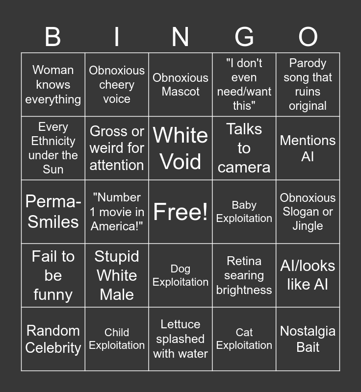 This bingo card has a free space and 24 words: Stupid White Male, Child Exploitation, White Void, Random Celebrity, Parody song that ruins original, Woman knows everything, Every Ethnicity under the Sun, Obnoxious cheery voice, Baby Exploitation, Dog Exploitation, Talks to camera, Perma- Smiles, Retina searing brightness, AI/looks like AI, Gross or weird for attention, Cat Exploitation, Obnoxious Slogan or Jingle, Obnoxious Mascot, Mentions AI, "Number 1 movie in America!", Nostalgia Bait, Fail to be funny, "I don't even need/want this" and Lettuce splashed with water.