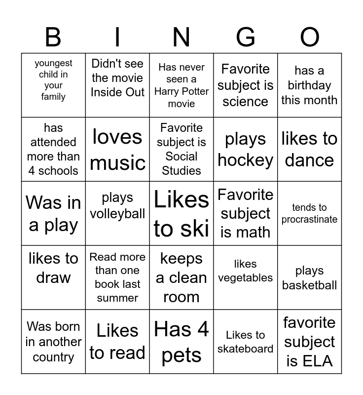 This bingo card has 45 words: Visited another country, Likes to ski, oldest or only child in your family, Was born in another country, Can walk to school, Likes to skateboard, Has never seen a Harry Potter movie, Likes pineapple on pizzas, has a birthday this month, Likes to read, Favorite subject is science, Favorite subject is math, keeps a clean room, Read more than one book last summer, Speaks two languages, Has 4 pets, Knows how to play a musical instrument, Was in a play, has been on student council, likes to dance, Didn't see the movie Inside Out, Can cook for yourself, Has never eaten guacamole, youngest child in your family, Was born in another state, tends to procrastinate, likes video games, dislikes pizza, likes vegetables, likes to draw, plays football, plays basketball, plays hockey, plays lax, plays baseball, plays volleyball, plays chess, likes the beach, favorite subject is ELA, Favorite subject is Social Studies, has attended more than 4 schools, plays hockey, plays tennis, loves music and has a collection of some kind.