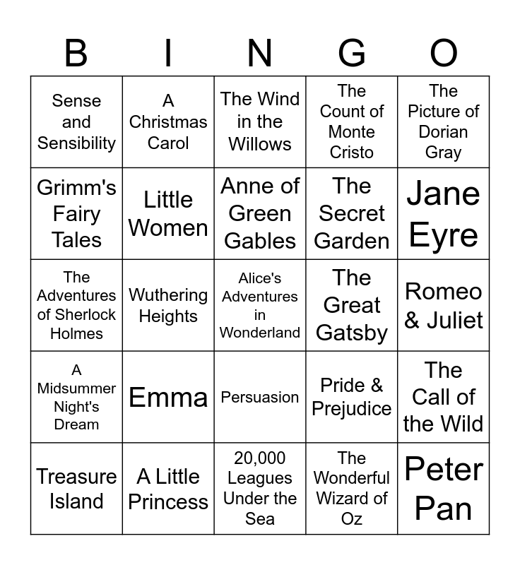 This bingo card has 25 words: Emma, 20,000 Leagues Under the Sea, Anne of Green Gables, Treasure Island, The Picture of Dorian Gray, Sense and Sensibility, Grimm's Fairy Tales, A Christmas Carol, The Great Gatsby, Persuasion, The Secret Garden, The Adventures of Sherlock Holmes, Pride & Prejudice, The Call of the Wild, Little Women, Peter Pan, Romeo & Juliet, The Wind in the Willows, Jane Eyre, Wuthering Heights, Alice's Adventures in Wonderland, A Little Princess, A Midsummer Night's Dream, The Count of Monte Cristo and The Wonderful Wizard of Oz.