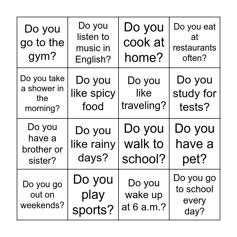 This bingo card has 16 words: Do you play sports?, Do you have a pet?, Do you cook at home?, Do you go to the gym?, Do you have a brother or sister?, Do you listen to music in English?, Do you walk to school?, Do you wake up at 6 a.m.?, Do you take a shower in the morning?, Do you like spicy food, Do you go out on weekends?, Do you eat at restaurants often?, Do you like rainy days?, Do you study for tests?, Do you like traveling? and Do you go to school every day?.