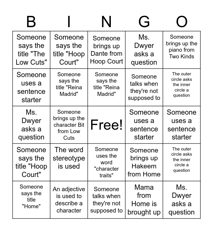 This bingo card has a free space and 29 words: Someone says the title "Home", Two stories are compared to eachother, Someone brings up the character Bit from Low Cuts, The outer circle asks the inner circle a question, Someone says the title "The Low Cuts", Someone brings up Dante from Hoop Court, Someone says the title "Reina Madrid", The word stereotype is used, Someone uses a sentence starter, An adjective is used to describe a character, Someone uses a sentence starter, Ms. Dwyer asks a question, Someone talks when they're not supposed to, Mama from Home is brought up, The outer circle asks the inner circle a question, An adjective is used to describe a character, Someone uses the word "character traits", Someone says the title "Hoop Court", Someone brings up the piano from Two Kinds, Ms. Dwyer asks a question, Someone brings up Hakeem from Home, Someone says the title "Two Kinds", Someone talks when they're not supposed to, Someone uses a sentence starter, Ms. Dwyer asks a question, Someone says the title "Hoop Court", The outer circle asks the inner circle a question, Someone says the title "Reina Madrid" and A student talks when they're not supposed to.