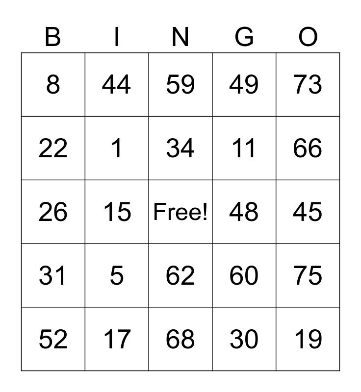 This bingo card has a free space and 24 words: 5, 17, 34, 52, 73, 8, 22, 44, 48, 62, 11, 26, 60, 75, 1, 30, 45, 59, 66, 15, 19, 31, 49 and 68.