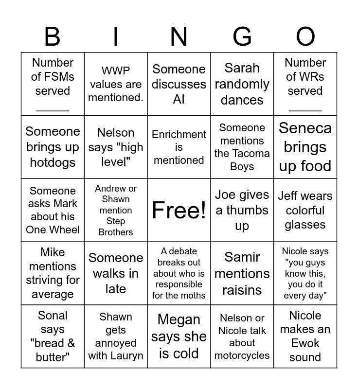 This bingo card has a free space and 24 words: Sonal says "bread & butter", Someone walks in late, Enrichment is mentioned, Nelson or Nicole talk about motorcycles, Number of WRs served _____, Number of FSMs served _____, WWP values are mentioned., Someone discusses AI, Joe gives a thumbs up, Jeff wears colorful glasses, Someone asks Mark about his One Wheel, Nelson says "high level", Samir mentions raisins, Nicole says "you guys know this, you do it every day", Someone brings up hotdogs, Shawn gets annoyed with Lauryn, Megan says she is cold, Sarah randomly dances, Seneca brings up food, Mike mentions striving for average, Andrew or Shawn mention Step Brothers, A debate breaks out about who is responsible for the moths, Someone mentions the Tacoma Boys and Nicole makes an Ewok sound.