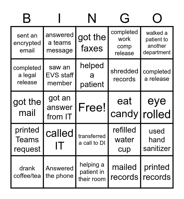 This bingo card has a free space and 24 words: called IT, Answered the phone, helped a patient, drank coffee/tea, walked a patient to another department, sent an encrypted email, completed a legal release, answered a teams message, eat candy, transferred a call to DI, shredded records, got the mail, refilled water cup, used hand sanitizer, saw an EVS staff member, mailed records, eye rolled, got the faxes, completed a release, got an answer from IT, printed records, printed Teams request, completed work comp release and helping a patient in their room.