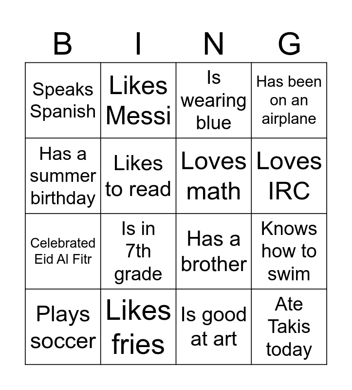 This bingo card has 16 words: Likes fries, Knows how to swim, Is wearing blue, Speaks Spanish, Celebrated Eid Al Fitr, Likes Messi, Has a brother, Is good at art, Has a summer birthday, Likes to read, Plays soccer, Has been on an airplane, Is in 7th grade, Loves IRC, Loves math and Ate Takis today.