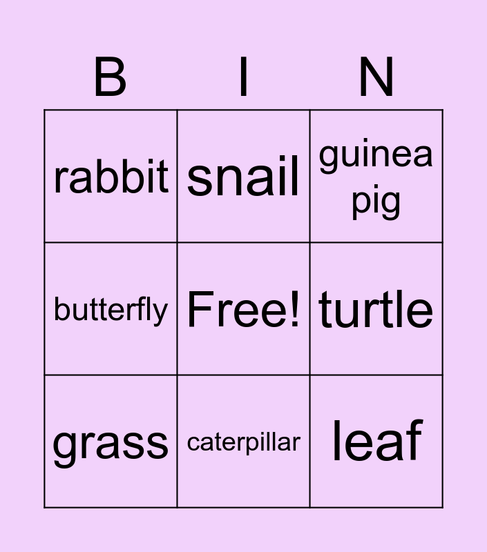 This bingo card has a free space and 11 words: tree, caterpillar, leaf, grass, snail, guinea pig, turtle, flower, butterfly, rabbit and green.