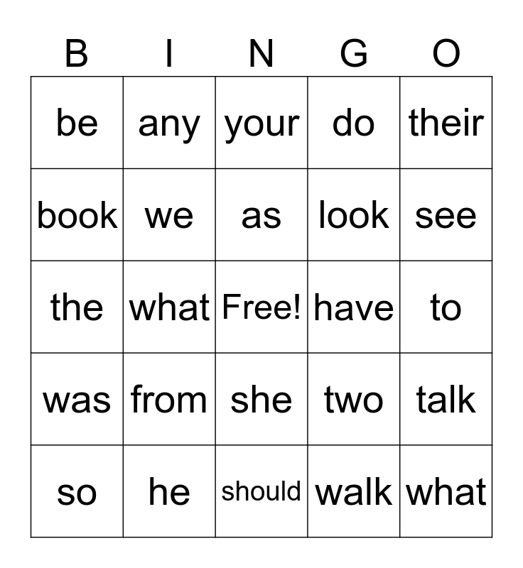 This bingo card has a free space and 40 words: there, the, said, we, he, she, as, and, their, was, what, do, what, to, have, from, me, be, you, your, talk, walk, look, book, were, friend, play, because, into, love, go, so, too, two, see, should, could, would, any and many.