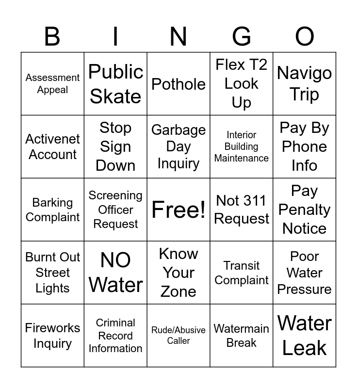This bingo card has a free space and 42 words: Damage To Cart, Garbage Day Inquiry, Upgrading Cart, NO Water, Watermain Break, Poor Water Pressure, Water Leak, Snow Removal Request, Pothole, Know Your Zone, Pay Penalty Notice, Pay By Phone Info, Screening Officer Request, Navigo Trip, Lost Item on Bus, Transit Complaint, Wildlife Report, Barking Complaint, New Pet License, Public Skate, Activenet Account, Tax Payment Option, Tax Land Title, Assessment Appeal, CityTax, Zoning Inquiry, Interior Building Maintenance, Noise Complaint, Manhole Concern, Ditch/Culvert Concern, Traffic Camera Footage, Burnt Out Street Lights, Stop Sign Down, Rude/Abusive Caller, 311 Commendation/Complaint, Fireworks Inquiry, Criminal Record Information, Not 311 Request, Claims, Windrow Clear Request, Flex T2 Look Up and Water Meter Issue.