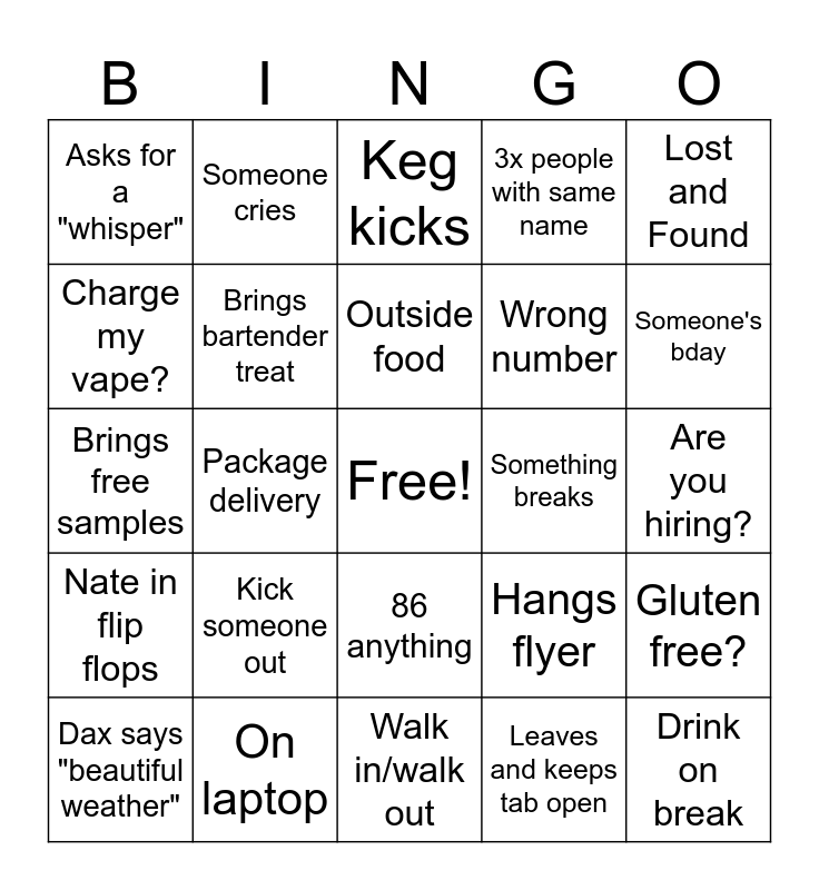 This bingo card has a free space and 24 words: Kick someone out, On laptop, Outside food, Dax says "beautiful weather", Lost and Found, Asks for a "whisper", Charge my vape?, Someone cries, Something breaks, 86 anything, Wrong number, Brings free samples, Hangs flyer, Gluten free?, Brings bartender treat, Leaves and keeps tab open, Are you hiring?, Keg kicks, Someone's bday, Package delivery, Drink on break, Nate in flip flops, 3x people with same name and Walk in/walk out.