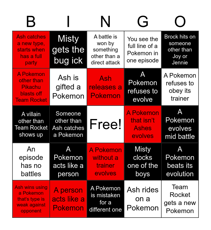 This bingo card has a free space and 24 words: A Pokemon acts like a person, A person acts like a Pokemon, Ash releases a Pokemon, Ash wins using a Pokemon that’s type is weak against opponent, Brock hits on someone other than Joy or Jennie, Ash catches a new type, starts when has a full party, A Pokemon other than Pikachu blasts off Team Rocket, Misty gets the bug ick, A Pokemon that isn’t Ashes evolves, A Pokemon without a trainer evolves, A Pokemon refuses to evolve, A villain other than Team Rocket shows up, Misty clocks one of the boys, A Pokemon beats its evolution, Ash is gifted a Pokemon, Ash rides on a Pokemon, A Pokemon evolves mid battle, A battle is won by something other than a direct attack, A Pokemon refuses to obey its trainer, Someone other than Ash catches a Pokemon, Team Rocket gets a new Pokemon, An episode has no battles, You see the full line of a Pokemon in one episode and A Pokemon is mistaken for a different one.