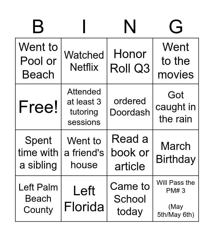 This bingo card has 16 words: Left Florida, March Birthday, Honor Roll Q3, Went to Pool or Beach, Spent time with a sibling, Watched Netflix, Read a book or article, Came to School today, Free!, Attended at least 3 tutoring sessions, Left Palm Beach County, Went to the movies, Went to a friend's house, Got caught in the rain, ordered Doordash and Will Pass the PM# 3 (May 5th/May 6th).