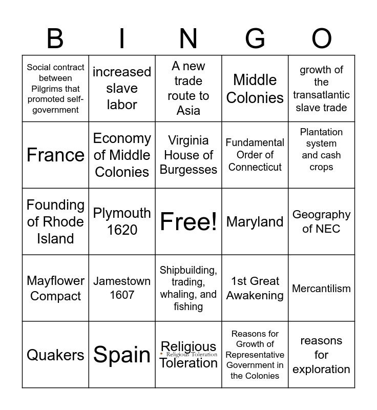 This bingo card has 1 images, a free space and 24 words: Jamestown 1607, Spain, Virginia House of Burgesses, Quakers, growth of the transatlantic slave trade, Social contract between Pilgrims that promoted self-government, France, increased slave labor, Maryland, Shipbuilding, trading, whaling, and fishing, Fundamental Order of Connecticut, Founding of Rhode Island, 1st Great Awakening, Mercantilism, Economy of Middle Colonies, Reasons for Growth of Representative Government in the Colonies, Geography of NEC, A new trade route to Asia, Plantation system and cash crops, Plymouth 1620, reasons for exploration, Mayflower Compact, Middle Colonies and Religious Toleration.