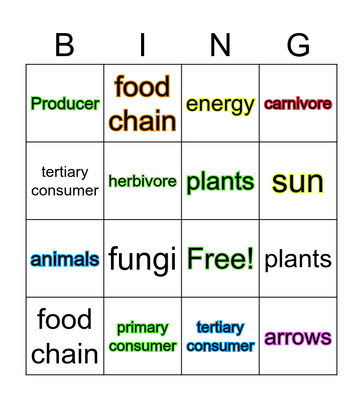 This bingo card has 21 words: primary consumer, fungi, food chain, secondary consumer, tertiary consumer, plants, Producer, energy, Free!, sun, animals, carnivore, arrows, consumer, herbivore, energy pyramid, food chain, fungi, tertiary consumer, plants and decomposer.