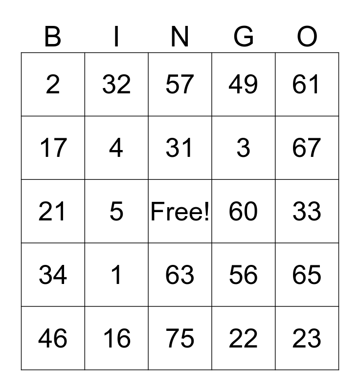 This bingo card has a free space and 24 words: 1, 16, 31, 46, 61, 2, 17, 32, 60, 63, 3, 21, 56, 65, 4, 22, 33, 57, 67, 5, 23, 34, 49 and 75.