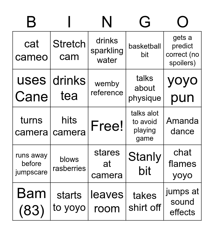 This bingo card has a free space and 24 words: blows rasberries, starts to yoyo, wemby reference, Bam (83), gets a predict correct (no spoilers), cat cameo, uses Cane, Stretch cam, talks alot to avoid playing game, stares at camera, talks about physique, turns camera, Stanly bit, chat flames yoyo, drinks tea, takes shirt off, Amanda dance, drinks sparkling water, yoyo pun, hits camera, jumps at sound effects, runs away before jumpscare, basketball bit and leaves room.