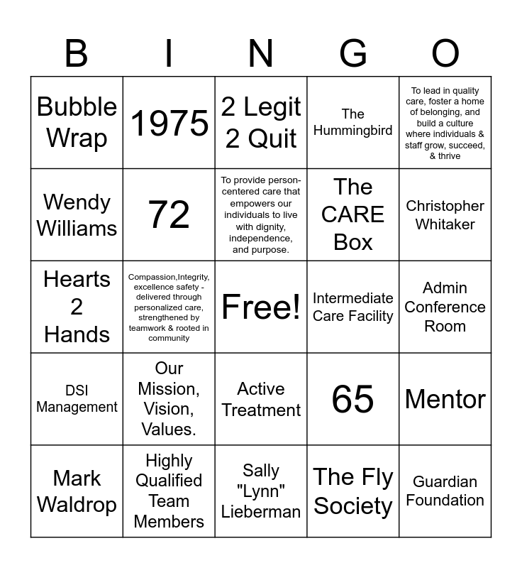 This bingo card has a free space and 24 words: Our Mission, Vision, Values., Highly Qualified Team Members, To provide person-centered care that empowers our individuals to live with dignity, independence, and purpose., Mark Waldrop, To lead in quality care, foster a home of belonging, and build a culture where individuals & staff grow, succeed, & thrive, Bubble Wrap, Wendy Williams, 1975, Intermediate Care Facility, Active Treatment, The CARE Box, Hearts 2 Hands, 65, Mentor, 72, The Fly Society, Admin Conference Room, 2 Legit 2 Quit, Christopher Whitaker, Compassion,Integrity, excellence safety - delivered through personalized care, strengthened by teamwork & rooted in community, Guardian Foundation, DSI Management, The Hummingbird and Sally "Lynn" Lieberman.