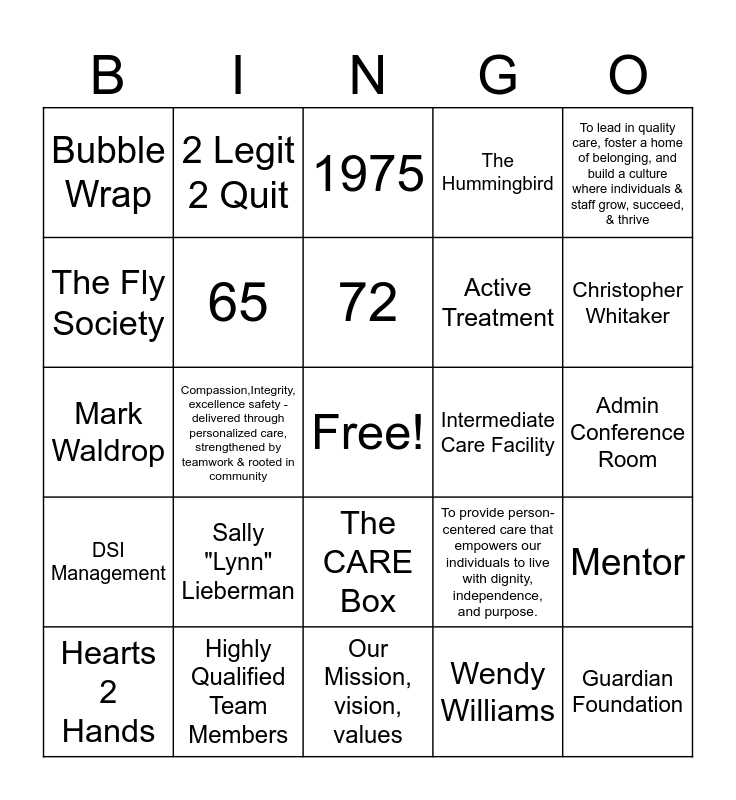 This bingo card has a free space and 24 words: Sally "Lynn" Lieberman, Highly Qualified Team Members, 72, Hearts 2 Hands, To lead in quality care, foster a home of belonging, and build a culture where individuals & staff grow, succeed, & thrive, Bubble Wrap, The Fly Society, 2 Legit 2 Quit, Intermediate Care Facility, The CARE Box, Active Treatment, Mark Waldrop, To provide person-centered care that empowers our individuals to live with dignity, independence, and purpose., Mentor, 65, Wendy Williams, Admin Conference Room, 1975, Christopher Whitaker, Compassion,Integrity, excellence safety - delivered through personalized care, strengthened by teamwork & rooted in community, Guardian Foundation, DSI Management, The Hummingbird and Our Mission, vision, values.