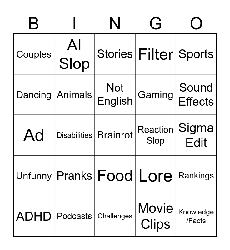 This bingo card has a free space and 24 words: Pranks, Podcasts, Not English, ADHD, Sports, Couples, Dancing, AI Slop, Reaction Slop, Food, Gaming, Ad, Lore, Rankings, Animals, Movie Clips, Sigma Edit, Stories, Sound Effects, Disabilities, Knowledge /Facts, Unfunny, Filter and Challenges.