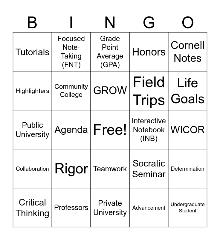 This bingo card has a free space and 33 words: Advanced Placement (AP), Advocate, Agenda, Bachelor’s Degree, Collaboration, Community College, Cornell Notes, Critical Thinking, Focused Note-Taking (FNT), Free-Application for Federal Student Aid (FAFSA), GROW, Grade Point Average (GPA), Graduate, Inquiry, Interactive Notebook (INB), Life Goals, Professors, Public University, Rigor, Socratic Seminar, Teamwork, Transcripts, Tutorials, WICOR, Private University, Undergraduate Student, Honors, Field Trips, Highlighters, Determination, Individual, Advancement and Higher Education.