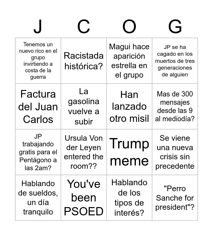 This bingo card has 16 words: You've been PSOED, Se viene una nueva crisis sin precedente, Magui hace aparición estrella en el grupo, Tenemos un nuevo rico en el grupo invirtiendo a costa de la guerra, JP trabajando gratis para el Pentágono a las 2am?, Racistada histórica?, Trump meme, Hablando de los tipos de interés?, Factura del Juan Carlos, La gasolina vuelve a subir, Hablando de sueldos, un día tranquilo, JP se ha cagado en los muertos de tres generaciones de alguien, Ursula Von der Leyen entered the room??, Mas de 300 mensajes desde las 9 al mediodía?, Han lanzado otro misil and "Perro Sanche for president"?.