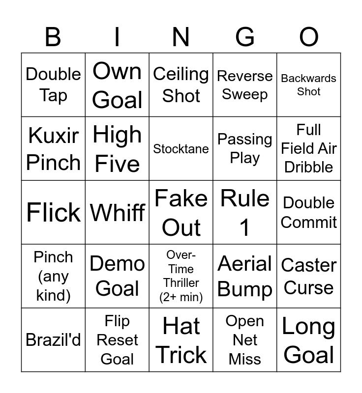 This bingo card has 30 words: Flip Reset Goal, Double Demo, Whiff, Bump-To-Score, Double Tap, Ceiling Shot, High Five, Over-Time Thriller (2+ min), Rule 1, Hat Trick, Double Commit, Fake Out, Open Net Miss, Long Goal, Full Field Air Dribble, Over Time, Aerial Bump, Pinch (any kind), Demo Goal, Backwards Shot, Flick, Kickoff Goal, Own Goal, Passing Play, Kuxir Pinch, Reverse Sweep, Caster Curse, Brazil'd, Stocktane and Pool Shot.