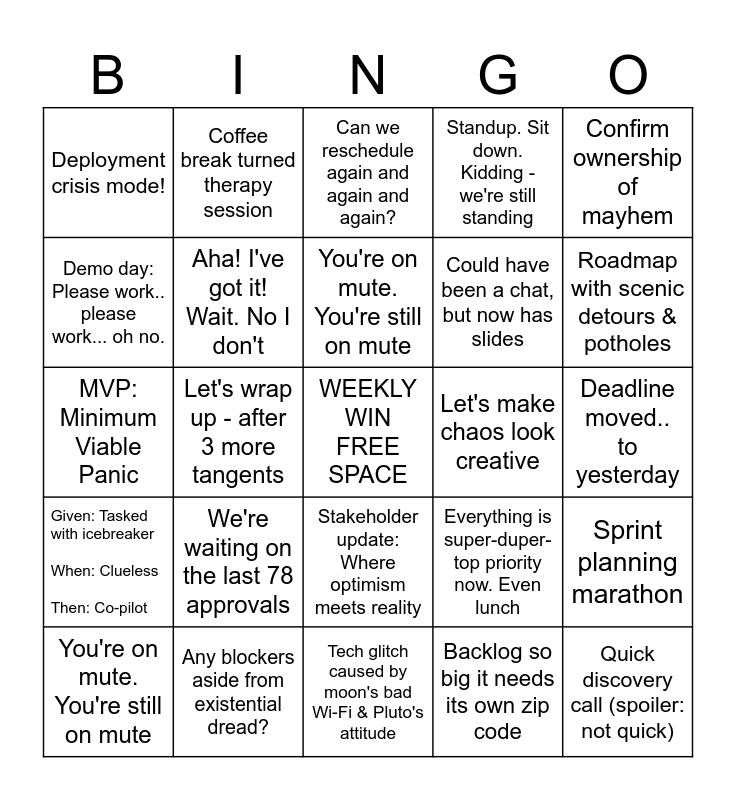 This bingo card has a free space and 29 words: You're on mute. You're still on mute, War room escalates to DEFCON 1, Let's wrap up - after 3 more tangents, Follow up email avalanche, Deployment crisis mode!, Can we reschedule again and again and again?, Aha! I've got it! Wait. No I don't, We're waiting on the last 78 approvals, Let's make chaos look creative, Any blockers aside from existential dread?, Deadline moved.. to yesterday, Quick discovery call (spoiler: not quick), Tech glitch caused by moon's bad Wi-Fi & Pluto's attitude, Backlog so big it needs its own zip code, Roadmap with scenic detours & potholes, Feature freeze... except for 12 last-minute changes, Stakeholder update: Where optimism meets reality, Given: Tasked with icebreaker When: Clueless Then: Co-pilot, Confirm ownership of mayhem, MVP: Minimum Viable Panic, Everything is super-duper-top priority now. Even lunch, Roadmap: A beautiful lie we all agree on, Could have been a chat, but now has slides, Demo day: Please work.. please work... oh no., Standup. Sit down. Kidding - we're still standing, Coffee break turned therapy session, Sprint planning marathon, You're on mute. You're still on mute and Can everyone hear me?.