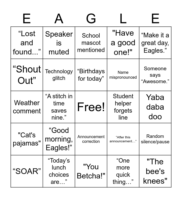 This bingo card has a free space and 24 words: “Good morning, Eagles!”, “Today’s lunch choices are…”, “Birthdays for today”, “SOAR”, “Make it a great day, Eagles.”, “Lost and found...”, “Shout Out”, Speaker is muted, Student helper forgets line, Announcement correction, Name mispronounced, Weather comment, “After this announcement…”, Random silence/pause, Technology glitch, “One more quick thing…”, Yaba daba doo, School mascot mentioned, Someone says “Awesome.”, “A stitch in time saves nine.”, "The bee's knees", "Cat's pajamas", "Have a good one!" and "You Betcha!".