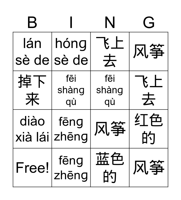 This bingo card has 16 words: fēnɡ zhēnɡ, 红色的, 飞上去, lán sè de, diào xià lái, hónɡ sè de, 风筝, 蓝色的, 掉下来, fēi shànɡ qù, Free!, 风筝, fēnɡ zhēnɡ, 飞上去, fēi shànɡ qù and 风筝.
