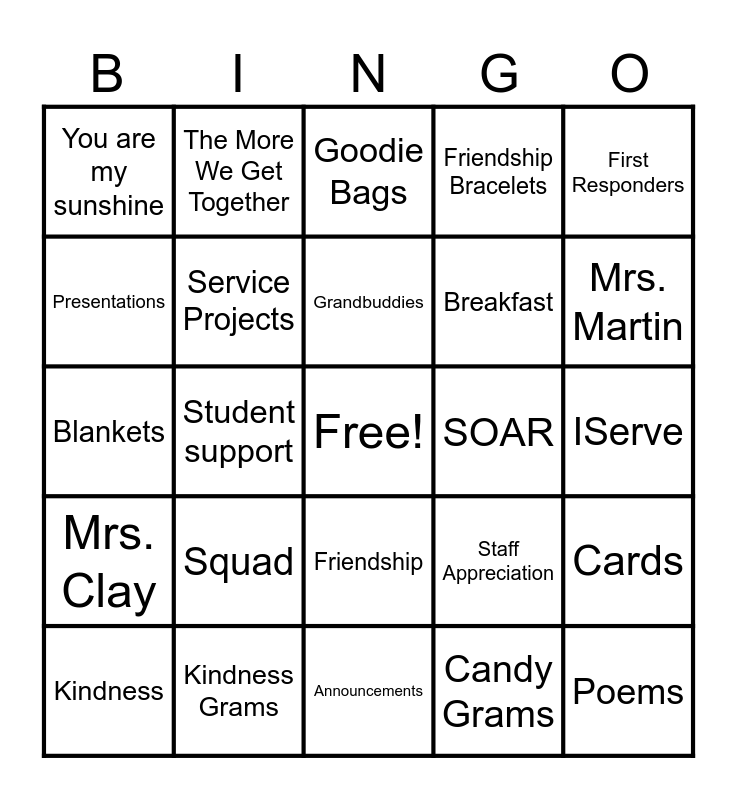 This bingo card has a free space and 24 words: Kindness, Squad, Grandbuddies, Candy Grams, First Responders, You are my sunshine, The More We Get Together, Goodie Bags, SOAR, IServe, Blankets, Service Projects, Staff Appreciation, Cards, Presentations, Kindness Grams, Announcements, Friendship Bracelets, Mrs. Martin, Mrs. Clay, Student support, Friendship, Breakfast and Poems.