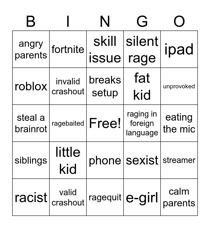 This bingo card has a free space and 24 words: little kid, valid crashout, breaks setup, racist, ipad, angry parents, roblox, fortnite, raging in foreign language, phone, fat kid, steal a brainrot, sexist, streamer, invalid crashout, e-girl, eating the mic, skill issue, unprovoked, ragebaited, calm parents, siblings, silent rage and ragequit.