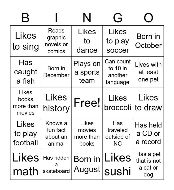 This bingo card has a free space and 24 words: Knows a fun fact about an animal, Has ridden a skateboard, Plays on a sports team, Likes math, Born in October, Likes to sing, Has caught a fish, Reads graphic novels or comics, Likes broccoli, Likes movies more than books, Can count to 10 in another language, Likes books more than movies, Has traveled outside of NC, Has held a CD or a record, Born in December, Likes sushi, Likes to draw, Likes to dance, Lives with at least one pet, Likes history, Has a pet that is not a cat or dog, Likes to play football, Likes to play soccer and Born in August.