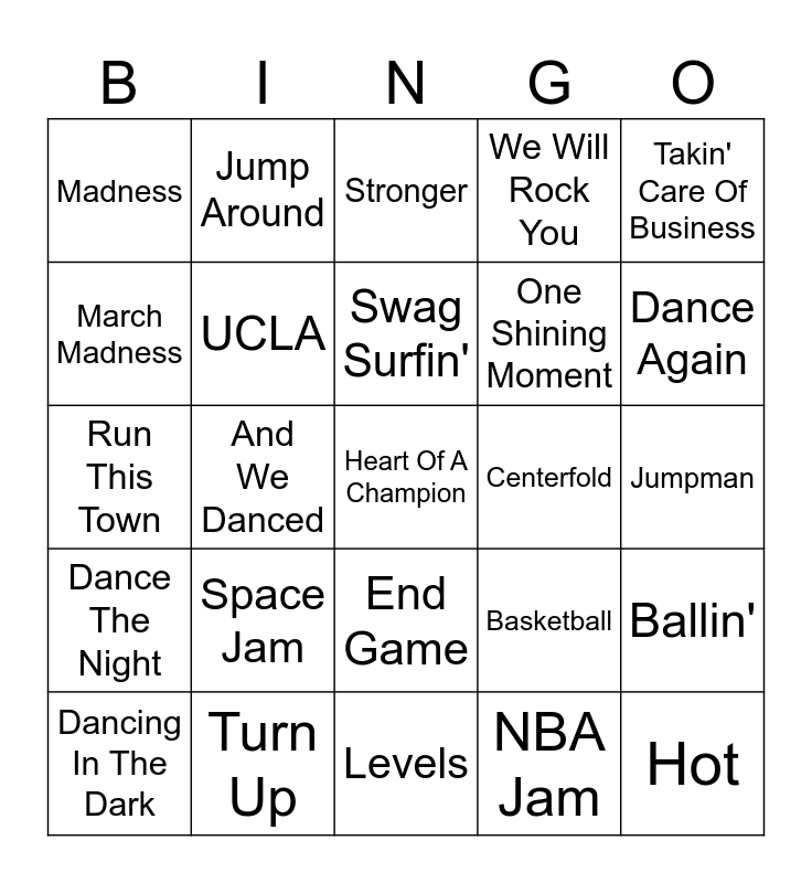 This bingo card has 46 words: March Madness College Basketball Theme on CBS, Heart Of A Champion, Memories, Levels, Space Jam, Bring Em Out, Jump Around, All Star, March Madness, All Of The Lights, UCLA, We Will Rock You, Ballin', Basketball, Whoomp! There It Is, Trophies, Swag Surfin', Centerfold, Hall of Fame, Takin' Care Of Business, And We Danced, NBA Jam, Madness, One Shining Moment, Centuries, Dance Again, Dancing In The Dark, Om Top Of The World, End Game, Dance The Night, Take My Breath, American Soul, My Songs Know What You Did In The Dark (Light Em Up), Gold On The Ceiling, Shot At The Night, Turn Up, Jumpman, Nonstop, Started From The Bottom, Work Hard, Play Hard, Hot, Stronger, Run This Town, It's Tricky, Can't Hold Us and My House.