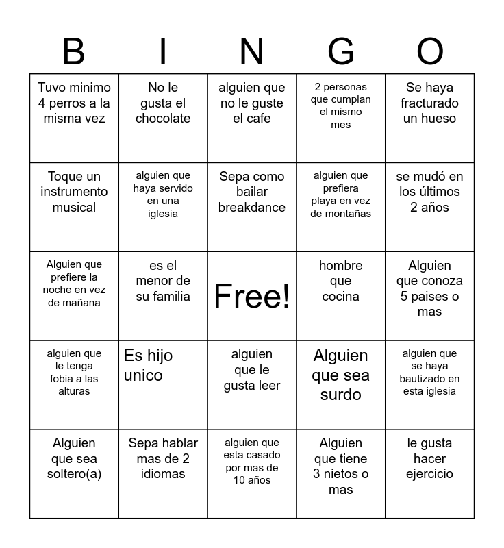 This bingo card has a free space and 24 words: Es hijo unico, Sepa hablar mas de 2 idiomas, Sepa como bailar breakdance, Alguien que sea soltero(a), Se haya fracturado un hueso, Tuvo minimo 4 perros a la misma vez, Toque un instrumento musical, No le gusta el chocolate, hombre que cocina, alguien que le gusta leer, alguien que prefiera playa en vez de montañas, Alguien que prefiere la noche en vez de mañana, Alguien que sea surdo, alguien que se haya bautizado en esta iglesia, alguien que haya servido en una iglesia, Alguien que tiene 3 nietos o mas, Alguien que conoza 5 paises o mas, alguien que no le guste el cafe, se mudó en los últimos 2 años, es el menor de su familia, le gusta hacer ejercicio, alguien que le tenga fobia a las alturas, 2 personas que cumplan el mismo mes and alguien que esta casado por mas de 10 años.