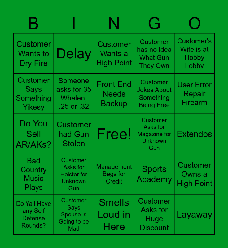 This bingo card has a free space and 40 words: Customer Mentions Bullfrog Corner, Do You Sell AR/AKs?, Customer Says Something Heavy is Light, Someone asks for 35 Whelen, .25 or .32, Customer Says Spouse is Going to be Mad, Management Begs for Credit, Front End Needs Backup, Call on Park 1, Customer's Wife is at Hobby Lobby, Bad Country Music Plays, Customer had Gun Stolen, Customer has no Idea What Gun They Own, Layaway, Extendos, Customer Asks for Magazine for Unknown Gun, Customer Asks for Holster for Unknown Gun, Pulls Gun from Pocket/Holster, Customer Wants to Dry Fire, Tries to Buy Handgun with Out of State License, Customer Wants a High Point, Customer Owns a High Point, Customer Asks for Huge Discount, Customer Jokes About Something Being Free, Customer Says Something Yikesy, Customer Open Carrying a Huge Gun, Customer Bragging About What Guns They Own, Clips, Customer Asks for Gun That Just Released, Beams, Customer has Bad Opinion/Advice, Do Yall Have any 5.56?, Do Yall Have any Self Defense Rounds?, Hollow Tips, Sports Academy, User Error Repair Firearm, Smells Loud in Here, 21A, Proceed, Delay and Denial.
