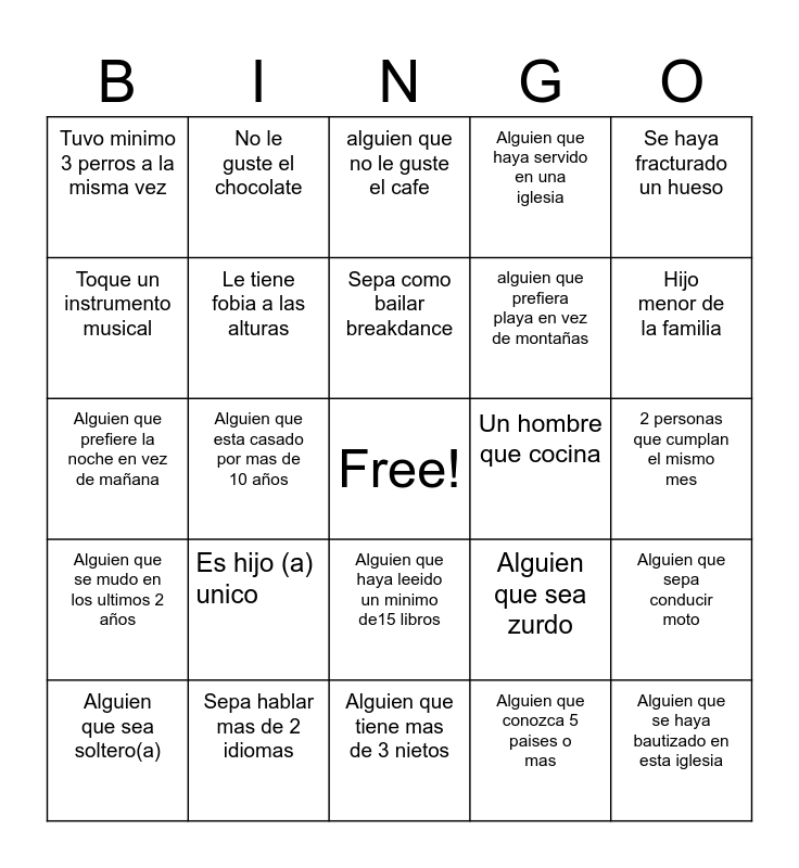 This bingo card has a free space and 24 words: Es hijo (a) unico, Sepa hablar mas de 2 idiomas, Sepa como bailar breakdance, Alguien que sea soltero(a), Se haya fracturado un hueso, Tuvo minimo 3 perros a la misma vez, Toque un instrumento musical, No le guste el chocolate, Un hombre que cocina, Alguien que haya leeido un minimo de15 libros, alguien que prefiera playa en vez de montañas, Alguien que prefiere la noche en vez de mañana, Alguien que sea zurdo, Alguien que sepa conducir moto, Le tiene fobia a las alturas, Alguien que conozca 5 paises o mas, 2 personas que cumplan el mismo mes, alguien que no le guste el cafe, Hijo menor de la familia, Alguien que esta casado por mas de 10 años, Alguien que se haya bautizado en esta iglesia, Alguien que se mudo en los ultimos 2 años, Alguien que haya servido en una iglesia and Alguien que tiene mas de 3 nietos.