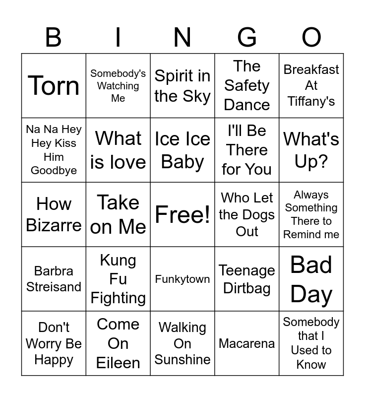 This bingo card has a free space and 29 words: Don't Worry Be Happy, The Lion Sleeps Tonight, Take on Me, Walking in Memphis, Torn, Spirit in the Sky, What is love, Kung Fu Fighting, Who Let the Dogs Out, Come On Eileen, Always Something There to Remind me, Somebody that I Used to Know, Walking On Sunshine, Macarena, What's Up?, Bitter Sweet Sumpony, Funkytown, Barbra Streisand, Breakfast At Tiffany's, How Bizarre, Teenage Dirtbag, She's so High, I'll Be There for You, Na Na Hey Hey Kiss Him Goodbye, The Safety Dance, Somebody's Watching Me, Bad Day, Ice Ice Baby and Billionaire.
