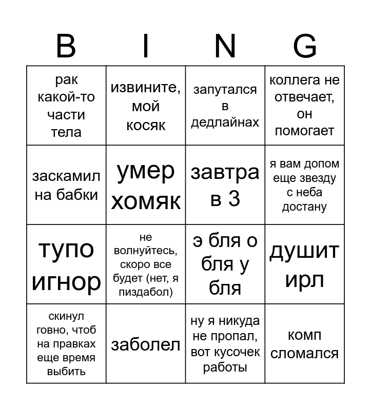 This bingo card has 16 words: заболел, душит ирл, запутался в дедлайнах, рак какой-то части тела, тупо игнор, извините, мой косяк, э бля о бля у бля, ну я никуда не пропал, вот кусочек работы, заскамил на бабки, умер хомяк, скинул говно, чтоб на правках еще время выбить, коллега не отвечает, он помогает, не волнуйтесь, скоро все будет (нет, я пиздабол), я вам допом еще звезду с неба достану, завтра в 3 and комп сломался.