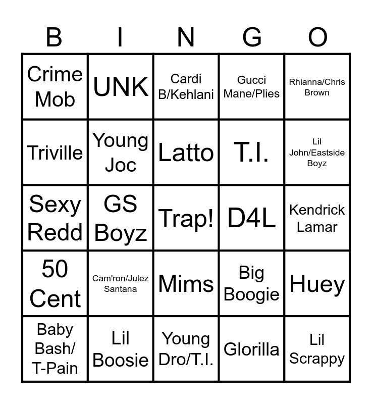 This bingo card has a free space and 24 words: Cam'ron/Julez Santana, Lil Boosie, Latto, Baby Bash/ T-Pain, Rhianna/Chris Brown, Crime Mob, Triville, UNK, D4L, Mims, T.I., Sexy Redd, Big Boogie, Huey, Young Joc, Glorilla, Kendrick Lamar, Cardi B/Kehlani, Lil John/Eastside Boyz, GS Boyz, Lil Scrappy, 50 Cent, Gucci Mane/Plies and Young Dro/T.I..