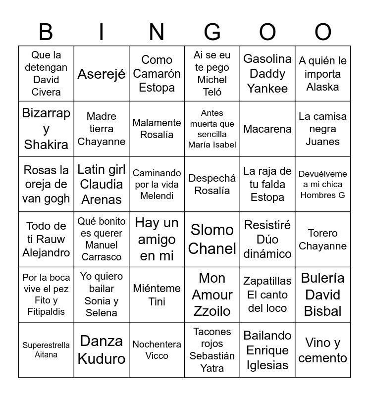 This bingo card has 36 words: Mon Amour Zzoilo, Miénteme Tini, Tacones rojos Sebastián Yatra, Bizarrap y Shakira, Todo de ti Rauw Alejandro, Despechá Rosalía, Madre tierra Chayanne, Nochentera Vicco, Gasolina Daddy Yankee, Zapatillas El canto del loco, La camisa negra Juanes, Ai se eu te pego Michel Teló, Bulería David Bisbal, Latin girl Claudia Arenas, Antes muerta que sencilla María Isabel, Que la detengan David Civera, Por la boca vive el pez Fito y Fitipaldis, La raja de tu falda Estopa, Rosas la oreja de van gogh, Como Camarón Estopa, Caminando por la vida Melendi, Qué bonito es querer Manuel Carrasco, Slomo Chanel, Hay un amigo en mi, Resistiré Dúo dinámico, Aserejé, Macarena, Danza Kuduro, Malamente Rosalía, A quién le importa Alaska, Vino y cemento, Superestrella Aitana, Torero Chayanne, Devuélveme a mi chica Hombres G, Yo quiero bailar Sonia y Selena and Bailando Enrique Iglesias.