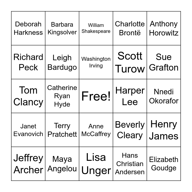 This bingo card has a free space and 26 words: Anne McCaffrey, Hans Christian Andersen, Washington Irving, Maya Angelou, Anthony Horowitz, Deborah Harkness, Richard Peck, Barbara Kingsolver, Nnedi Okorafor, Beverly Cleary, Scott Turow, Tom Clancy, Henry James, Jeffrey Archer, Catherine Ryan Hyde, Nick Hornby, Charlotte Brontë, Janet Evanovich, William Shakespeare, Elizabeth Goudge, Sue Grafton, Lisa Unger, Harper Lee, Terry Pratchett, Leigh Bardugo and P.C. Cast.