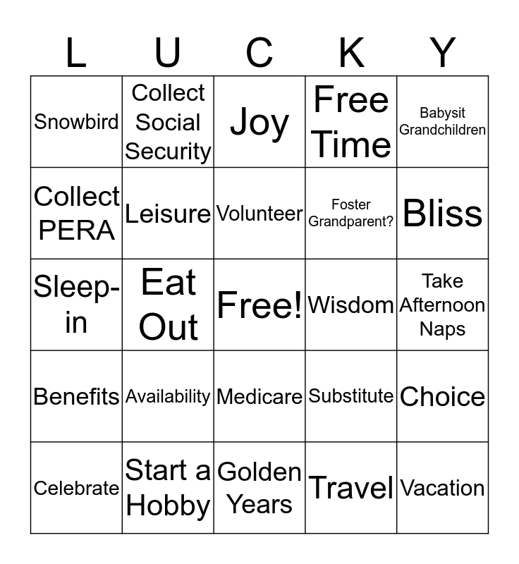 This bingo card has a free space and 26 words: Medicare, Travel, Volunteer, Start a Hobby, Babysit Grandchildren, Snowbird, Collect PERA, Collect Social Security, Take Afternoon Naps, Substitute, Foster Grandparent?, Sleep-in, Choice, Celebrate, Eat Out, Freedom, Free Time, Benefits, Joy, Vacation, Bliss, Golden Years, Wisdom, Availability, Leisure and New Career.