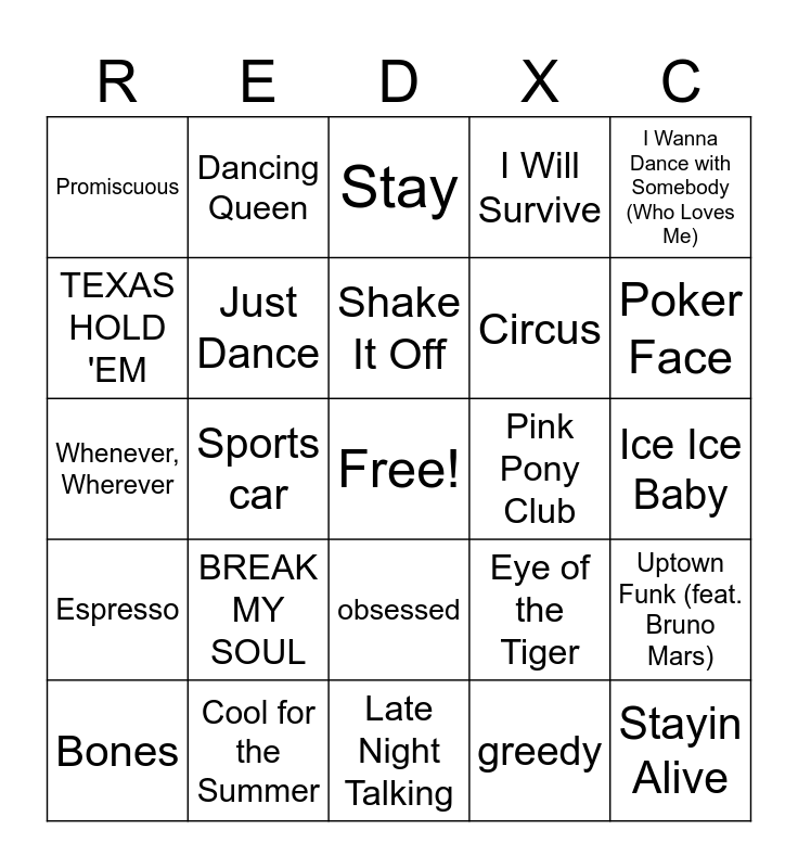 This bingo card has a free space and 49 words: Dance The Night, Stayin Alive, The Man, Late Night Talking, BREAK MY SOUL, Another One Bites The Dust, Dancing Queen, Hips Don't Lie (feat. Wyclef Jean), TEXAS HOLD 'EM, Not Like Us, Just Dance, I Will Survive, Uptown Funk (feat. Bruno Mars), Eye of the Tiger, Man in the Mirror, Flowers, Shake It Off, Pink Pony Club, Bad Romance, I Wanna Dance with Somebody (Who Loves Me), Sports car, greedy, Promiscuous, Circus, Miss possessive, Poker Face, Bones, Gimme More, obsessed, Espresso, Girls Just Want to Have Fun, Cake By The Ocean, Wannabe, Get Lucky, Cool for the Summer, Too Sweet, Jolene, Please Please Please, Ice Ice Baby, The Real Slim Shady, Señorita, Happier Than Ever, Rumour Has It, Hollaback Girl, Whenever, Wherever, Stay, Stick Season, Everybody (Backstreet's Back) and Counting Stars.
