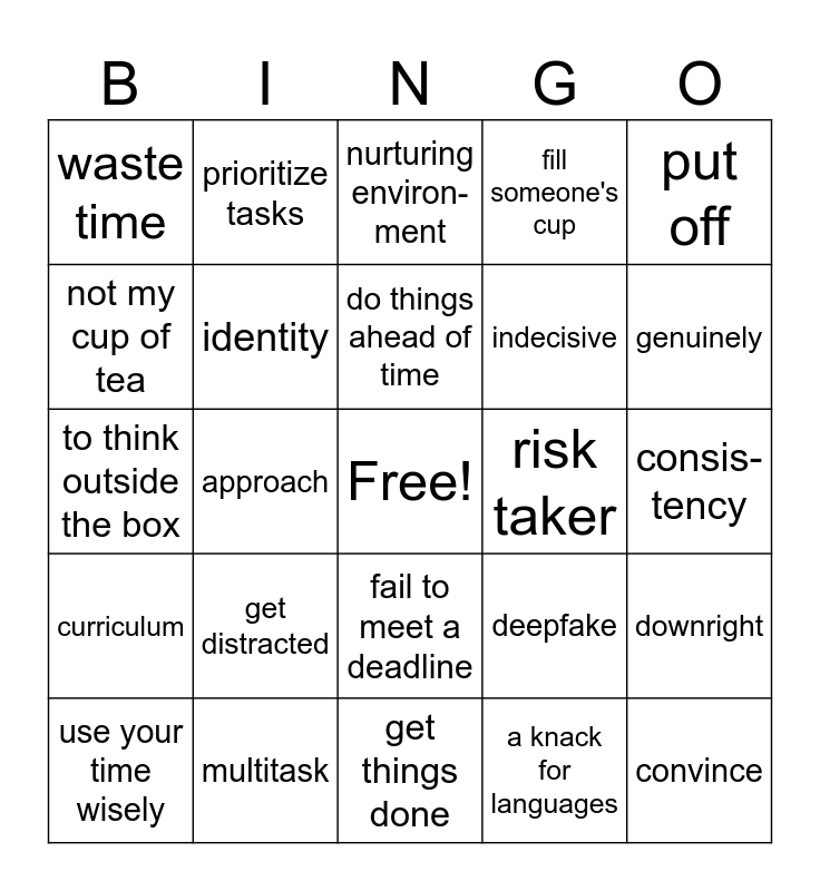 This bingo card has a free space and 24 words: get distracted, multitask, do things ahead of time, use your time wisely, put off, waste time, not my cup of tea, prioritize tasks, risk taker, fail to meet a deadline, indecisive, to think outside the box, deepfake, downright, identity, a knack for languages, consis- tency, nurturing environ-ment, genuinely, approach, convince, curriculum, fill someone's cup and get things done.
