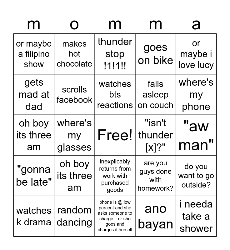 This bingo card has a free space and 24 words: oh boy its three am, random dancing, watches bts reactions, watches k drama, or maybe i love lucy, or maybe a filipino show, gets mad at dad, makes hot chocolate, "isn't thunder [x]?", inexplicably returns from work with purchased goods, falls asleep on couch, oh boy its three am, are you guys done with homework?, do you want to go outside?, scrolls facebook, ano bayan, "aw man", thunder stop !1!1!!, where's my phone, where's my glasses, i needa take a shower, "gonna be late", goes on bike and phone is @ low percent and she asks someone to charge it or she goes and charges it herself.