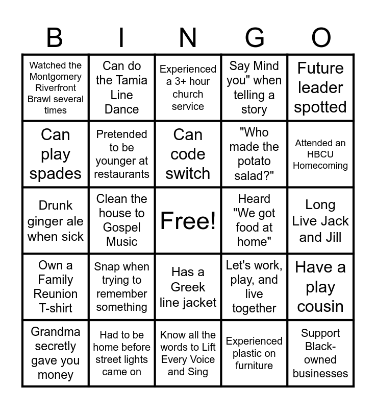 This bingo card has a free space and 28 words: Have a play cousin, Been burned by hot comb, "Who made the potato salad?", Experienced plastic on furniture, Can play spades, Experienced a 3+ hour church service, Can do the Tamia Line Dance, Own a Family Reunion T-shirt, Heard "We got food at home", Grandma secretly gave you money, Drunk ginger ale when sick, Say Mind you" when telling a story, Had to be home before street lights came on, Know all the words to Lift Every Voice and Sing, Attended an HBCU Homecoming, Have a nickname only your family calls you, Snap when trying to remember something, Pretended to be younger at restaurants, Can code switch, Has a Greek line jacket, Watched the Montgomery Riverfront Brawl several times, Watched all of the Friday movies, Support Black-owned businesses, Clean the house to Gospel Music, Long Live Jack and Jill, Let's work, play, and live together, Future leader spotted and For the children.